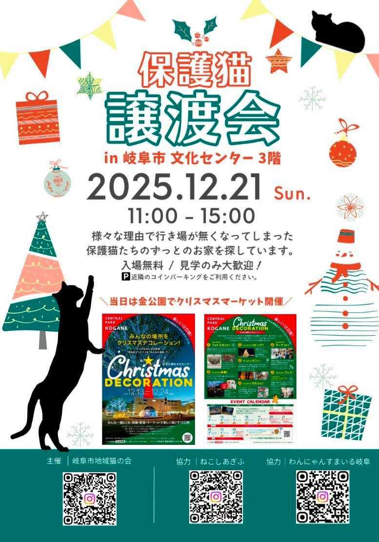 岐阜市地域猫の会では、地域猫活動の中で保護された猫たちのために、定期的に譲渡会を開催しています。